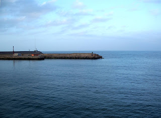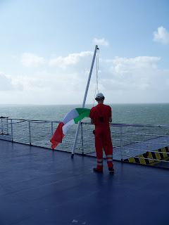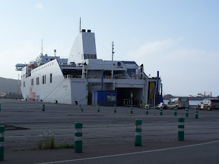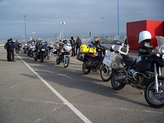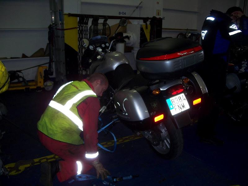 El viaje en barco fue una experiencia muy agradable, hay que llegar a puerto dos horas antes de la hora de salida, o sea a las 7 pero como las motos embarcan las últimas después de coches y camiones, pues hay que esperar un par de horas en la línea de salida. Cuando te lo indican vas entrando al barco, posas la moto donde te manden, sacas las cosas que necesitas (que no vas a poder volver a ella hasta el desembarco), pones pata de cabra, no caballete, metes primera, dejas que la amarren y subes hacia recepción del barco por la escalera mecánica.